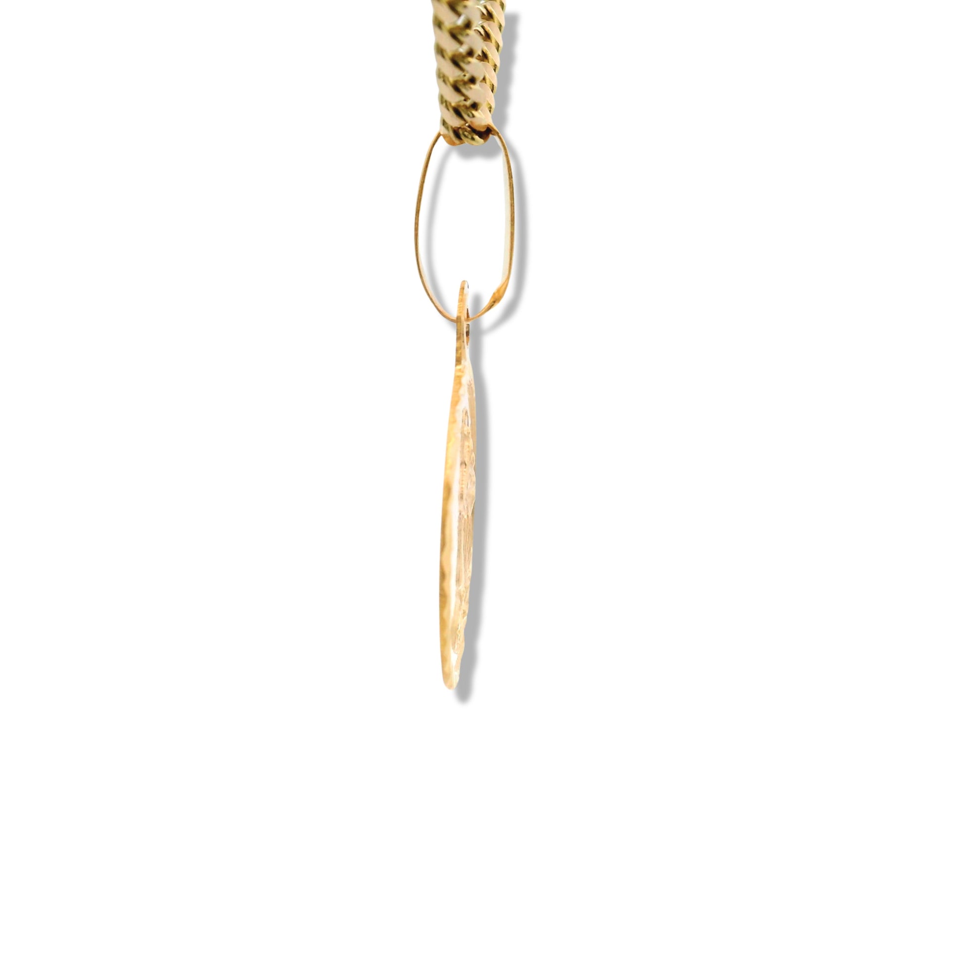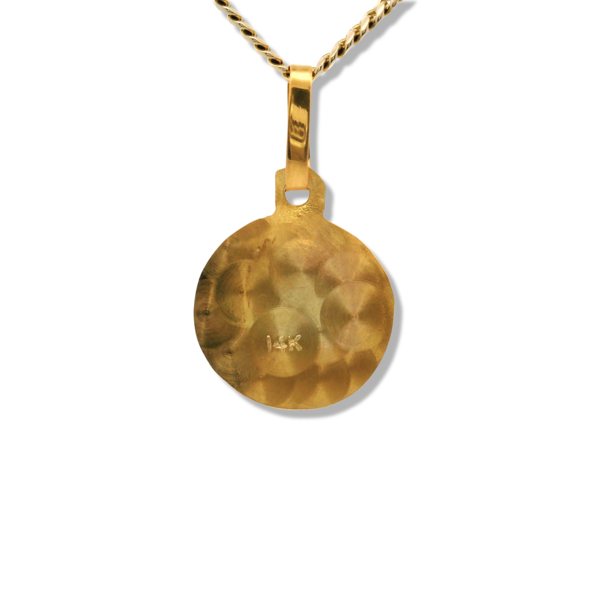 Ce superbe pendentif en or présente une magnifique gravure religieuse de la « Vierge de la Charité », capturant l'essence de la foi et de l'élégance. Les détails complexes du médaillon rond sont complétés par une délicate chaîne torsadée, ce qui en fait un accessoire idéal à porter au quotidien ou pour une occasion spéciale. occasions. Ce magnifique pendentif capture l'essence de l'élégance et de la dévotion.
